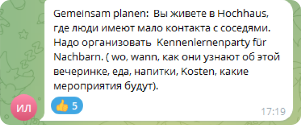 Мне нужно было за полгода выучить немецкий с нуля до B1 и ваши материалы по письму и устной части мне очень сильно помогли структурировать подготовку к ним. Сдала Goethe B1 в декабре прошлого года, все части выше 90, шпрехен так вообще 95, что мне кажется абсолютно невероятным, так что еще раз сердечно благодарю 🙏