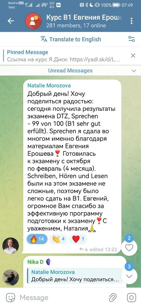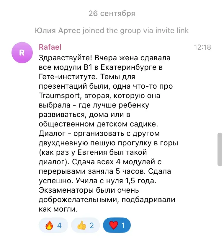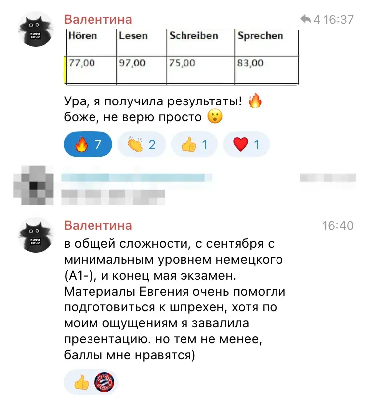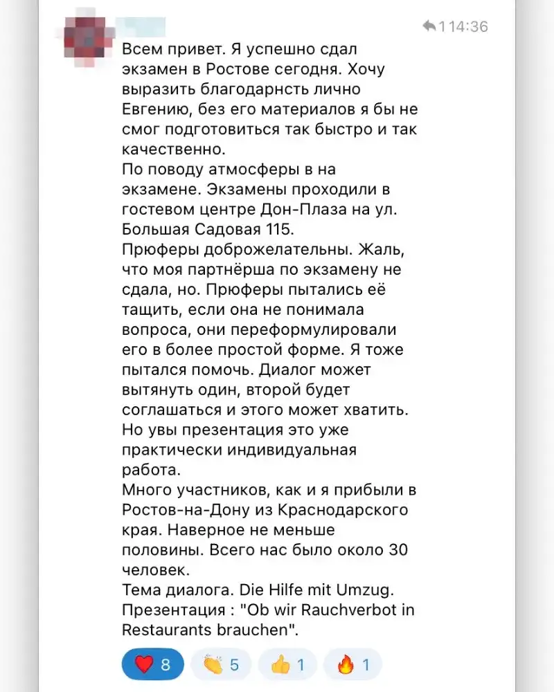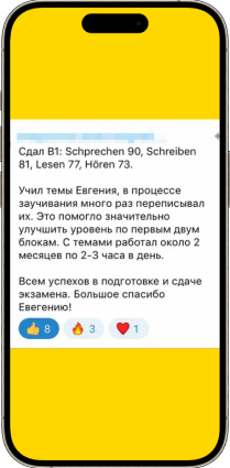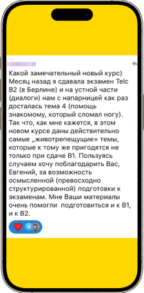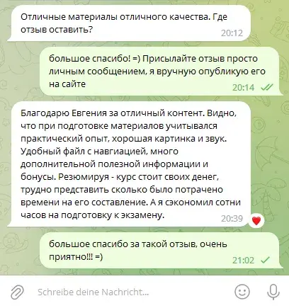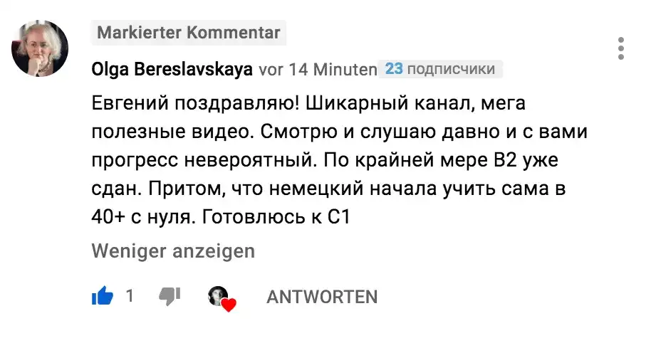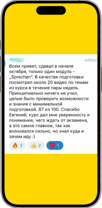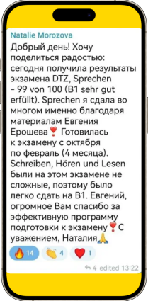 Добрый день! Хочу поделиться радостью: сегодня получила результаты экзамена DTZ, Sprechen - 99 von 100 (B1 sehr gut erfüllt). Sprechen я сдала во многом именно благодаря материалам Евгения Ерошева: Готовилась к экзамену с октября по февраль (4 месяца). Schreiben, Hören und Lesen были на этом экзамене не сложные, поэтому было легко сдать на В1. Евгений, огромное Вам спасибо за эффективную программу подготовки к экзамену.С уважением, Наталия