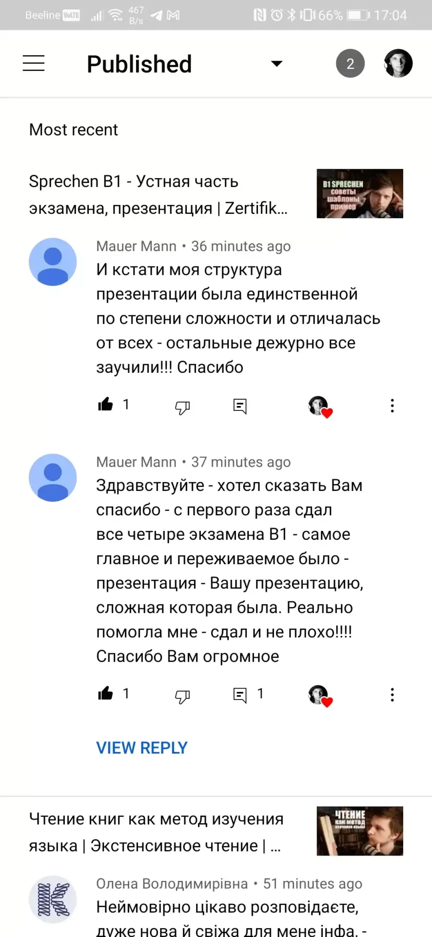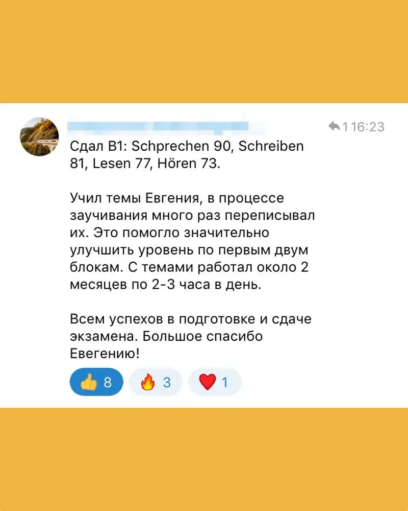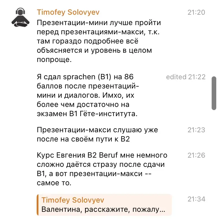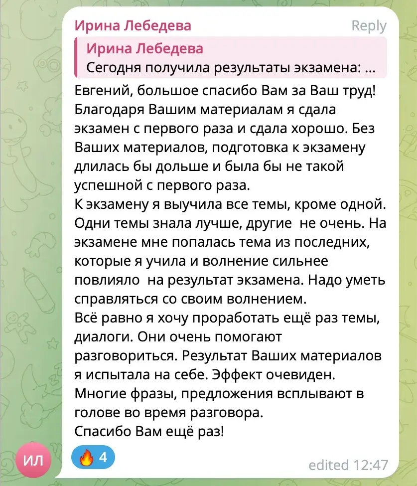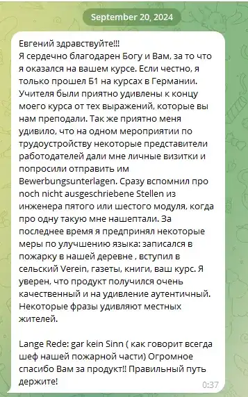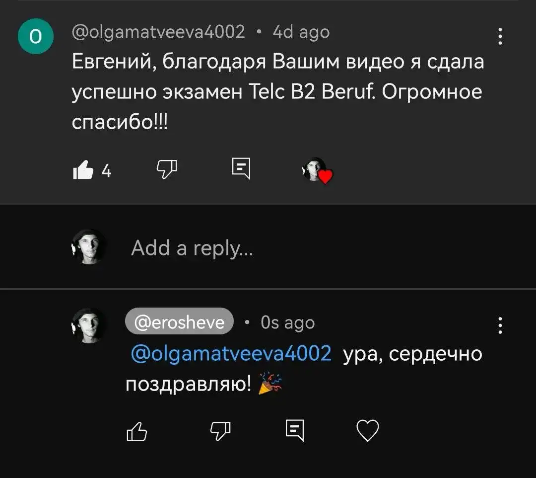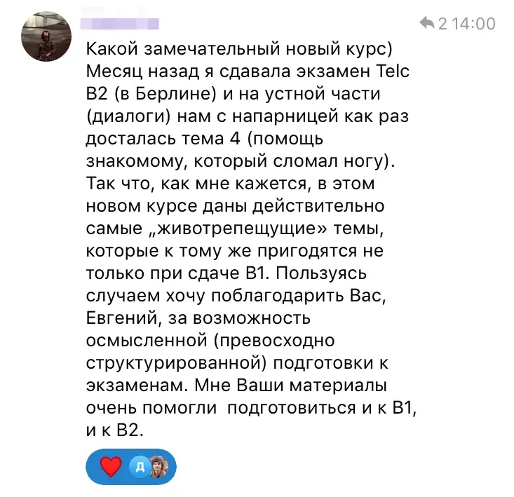 Добрый день Евгений, хочу вас лично поблагодарить за ваши материалы, обычно я скуп на комплименты, но вчера меня переполнили чувства. Очень выручила начитка и так же были не лишними фразы с Презентаций, у меня друзья в Германии с высшим уровнем чем у меня и то этого не знали. Тест я проходил в Германии так как живу там, Telc Zettifikat, прюфера естественно немцы, но даже они удивлялись фразам которые не для В1. В общем теперь я для себя дальше буду учить В2 ну и в дальнейшем буду использовать ваш материал, жалко что в В 2 у вас нету напиток таких с видео.