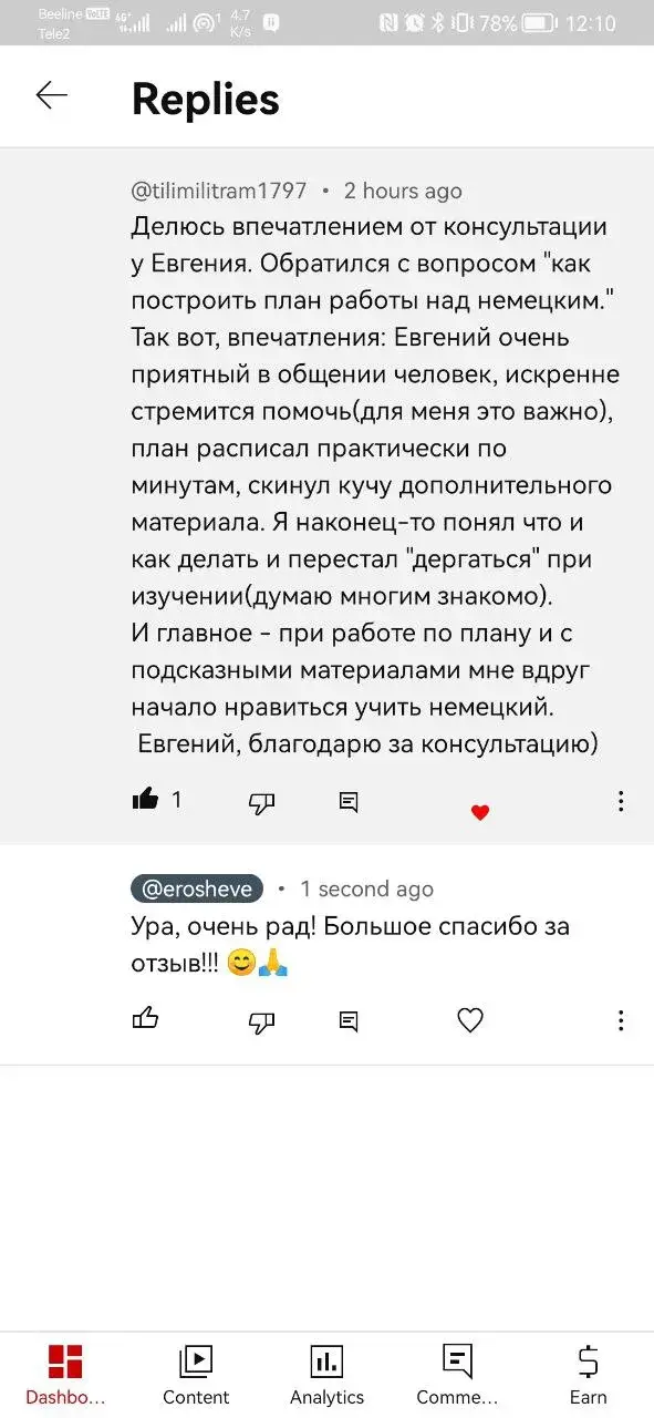 За каждым учебным видео Евгения стоит большая аналитическая работа. Это заметно по тому, насколько внятно и ёмко подаётся сам материал, какой бы сложной ни была тема. Это касается как объяснения грамматики (моё любимое видео - про склонение прилагательных, где всё оказывается проще, чем казалось), так и подготовки к экзамену B1. Советы из его видео по базовым принципам написания письма и по "скелету" презентации сработали - я очень неплохо сдала экзамен! Сейчас учу немецкий дальше, и канал Евгения продолжает мне в этом помогать.